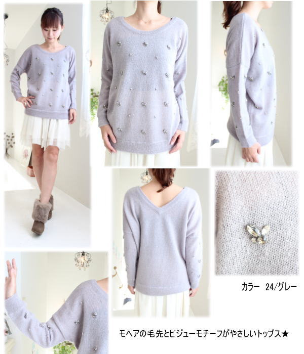 GRACE CONTINENTAL モヘア刺繍トップス 素材 モヘア50% ナイロン30% ウール20% サイズ 36(身幅61cm/着丈56cm/裄丈72cm) 特徴 モヘアの毛足とビジューモチーフがやさしいトップスです☆