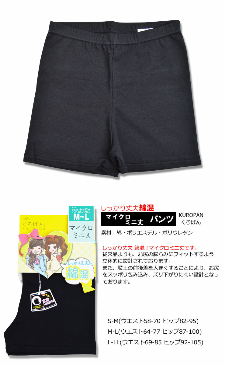 素材 綿・ポリエステル・ポリウレタン サイズ S-M(ウエスト58-70 ヒップ82-95) M-L(ウエスト64-77 ヒップ87-100) L-LL(ウエスト69-85 ヒップ92-105) 特徴 しっかり丈夫綿混マイクロミニ丈パンツです。